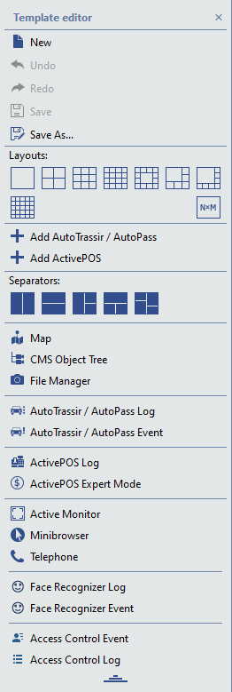 button will display the Template editor menu, which can be used to configure the appearance of the video monitor interface.