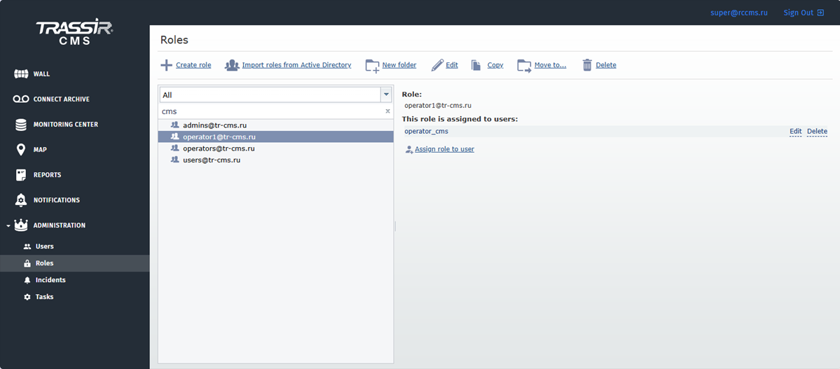 A Role is a set of permissions and rules which determine user access rights to various TRASSIR CMS objects.