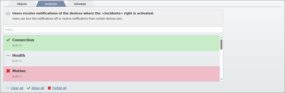 The Incidents tab lets you configure the specific role access rights to the incidents. Users receive notifications about the operation of the devices with the help of the incidents.