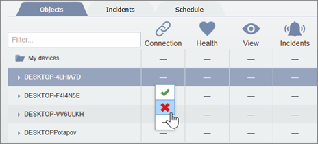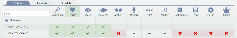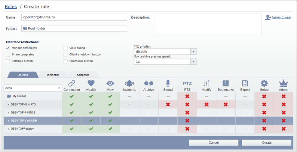 The Objects tab lets you specify user access rights to the objects, connected to TRASSIR CMS. Here you can determine which option will be enabled or disabled in the role, assigned to the user.