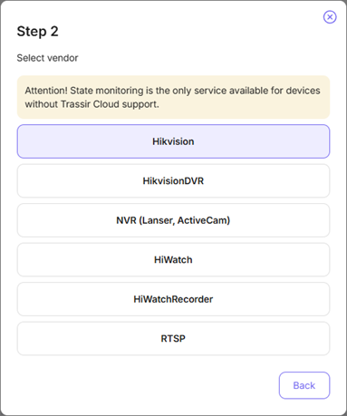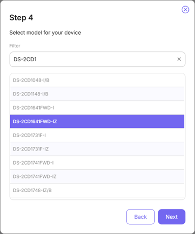 Wait several seconds for the Cloud to connect to the IP camera. Select the model of the device and complete the connection by clicking Next.