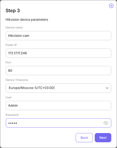 Enter the Device name and connection parameters: Public IP, Port, User and Password.