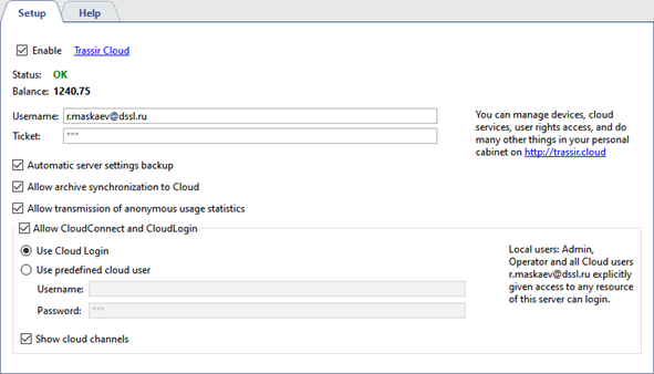 Open the Cloud tab in the connected server settings and enter Username and Ticket into corresponding fields.