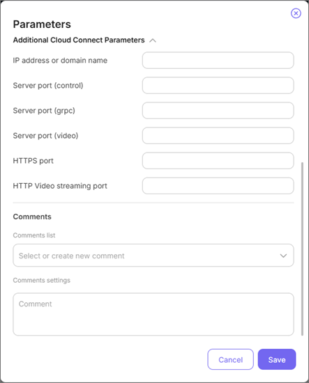 You can set up direct P2P connection between TRASSIR CMS and TRASSIR server. To do this, expand the Additional Cloud Connect parameters menu and specify the connection parameters.