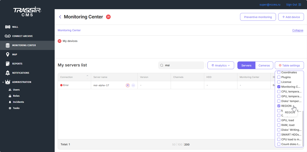 To show the comments to the TRASSIR CMS devices, click Table settings button and check the boxes next to the corresponding comments.