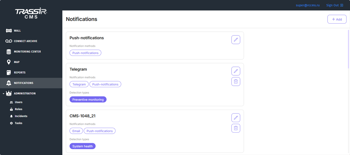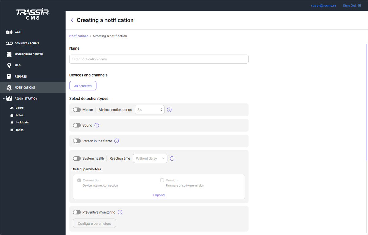 To quickly monitor the status of your video surveillance system, TRASSIR CMS allows you to configure notifications to be sent to the operator interface and to email.