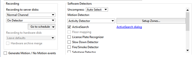 To activate the plugin go to the Channel settings to the Software detectors settings group and select ActiveSearch. In case the archive search is required, open the ActiveSearch dialog link.