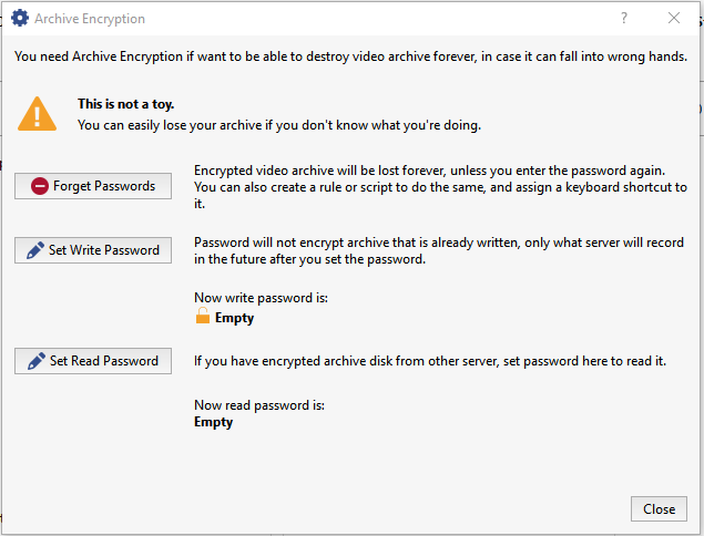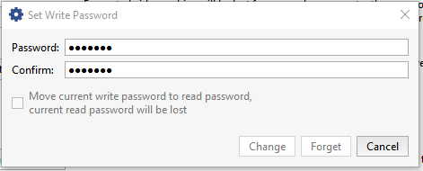 Use the Forget button if you need to disable archive encryption. If you do this, the entire encrypted archive will become unavailable and the new archive will be saved in unencrypted form. To access a previously saved encrypted archive, enter the read password or re-enable archive encryption using the same password.