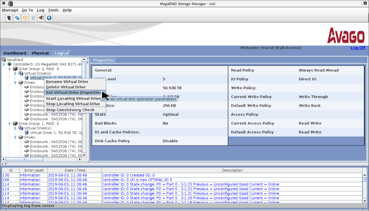 Open the Logical tab and then with the right click on the virtual drive select the Set Virtual Drive Properties