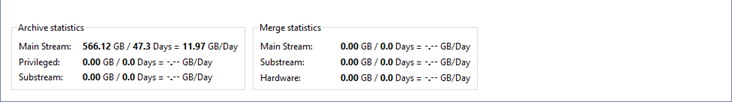 The archive's general statistics are displayed in the bottom part of the window. You can view the depth of days and the total volume of data separately for the primary and auxiliary streams. You can also view the statistics for privileged channels. A calculation of the disk space necessary to store one day of archive recordings is also presented here.