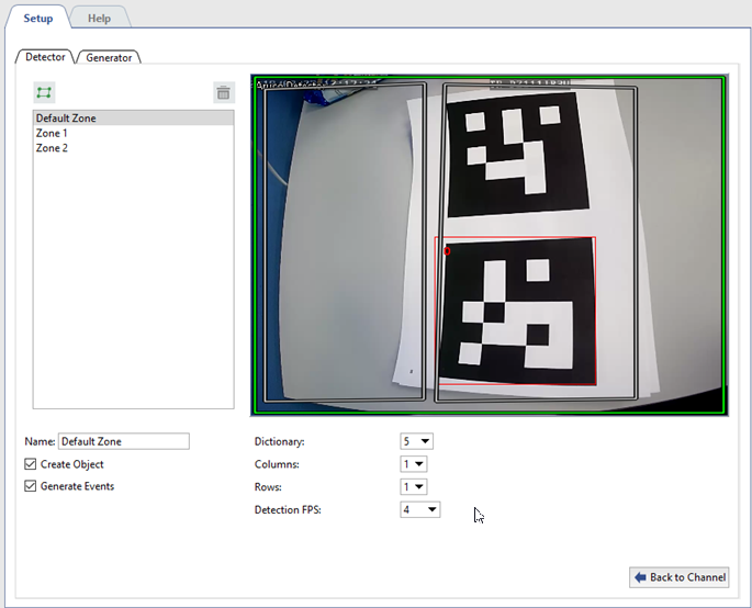 The values displayed in the Dictionary, Columns and Rows fields will be used for ArUco detector settings on Detector tab.