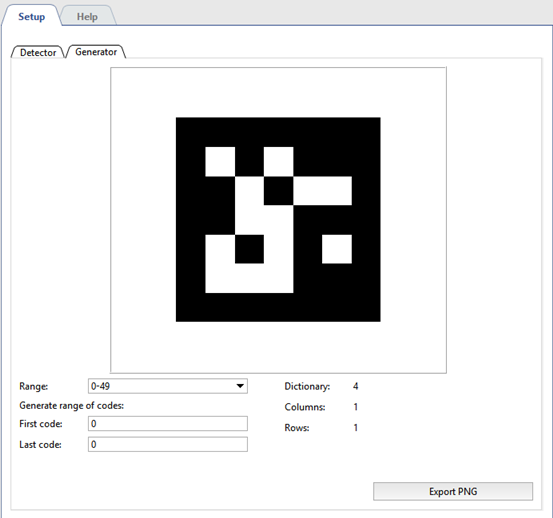 To create ArUco marker images, enter the range of numbers into First code and Last code fields.