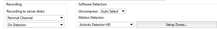 To enable a software-based detector, in the Software-based detectors area of the Channel settings window, select Activity detector or HD activity detector in the Motion detector dropdown list. Clicking Setup Zones... will open the settings window.