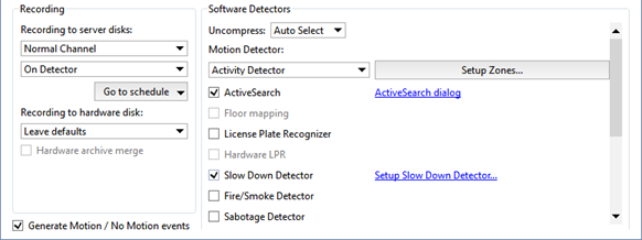 Motion detectors may either be hardware-based or software-based. Hardware-based detectors do not require any server resources, i.e. video processing is performed on the device itself. Software-based detectors use server resources. Moreover, some devices do not have hardware-based detector or a hardware-based detector may not be supported for a given device.