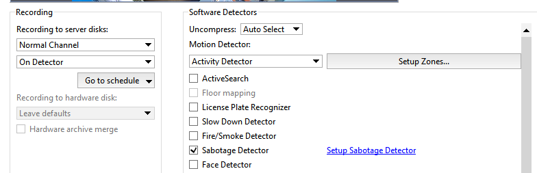 To enable the detector, go the Channel settings to the Software detectors area and select the Sabotage detector. Click Setup Sabotage detector to open the settings window.