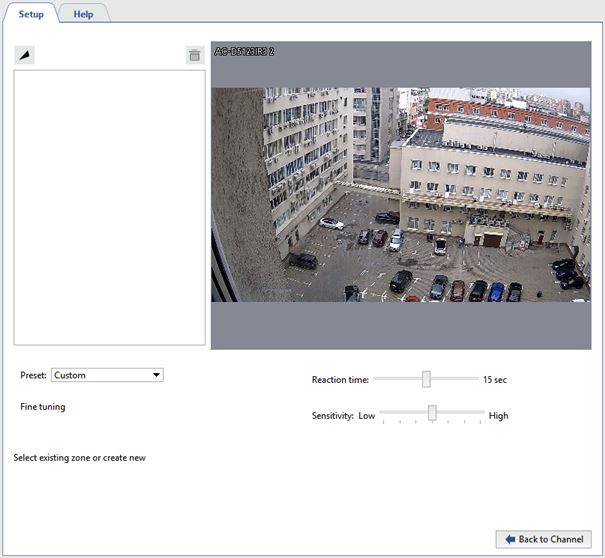 Refrain from setting high value of this parameter as detector needs certain time to analyse the image and it will last for Reaction time * 3. Thus, in case response time is 20 sec., detector will need 60 sec. for analysis. That is sabotage can be detected only in 1 minute following camera activation. In addition, following one sabotage detecting, the subsequent sabotage will be detected also in 1 minute.