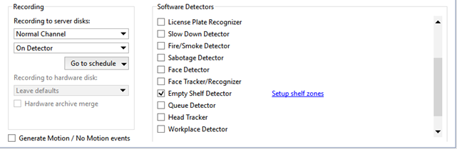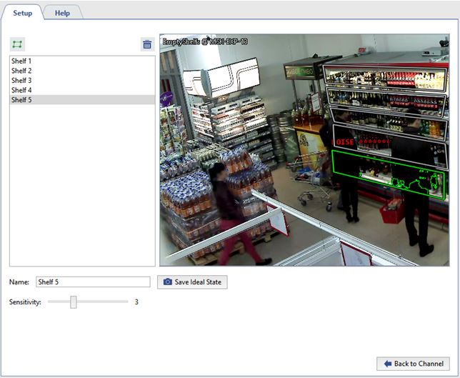 To set up the empty shelf detector zones open Channel settings in the Software detectors area and select Empty shelf detector. Click the Setup empty shelf detector link to open the setting window.
