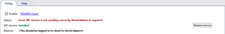 If errors occur in the operation of the MC Service, an error message will appear, and the Restore service button will become available. Clicking this button will launch the installation wizard.