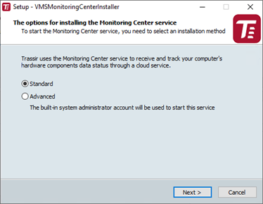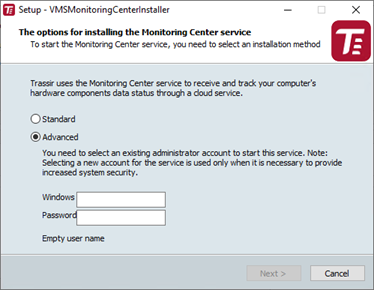In Advanced mode, enter the administrator account credentials under which the service will operate. In Standard mode, the current OS user account is used.