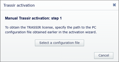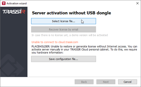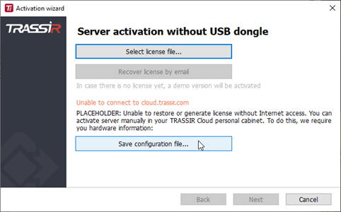 Activation Wizard will report that it is unable to contact the TRASSIR cloud. Click Save configuration file... and store the configuration file. Activation Wizard will close. Transfer the configuration file to a computer with Internet access.
