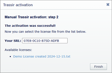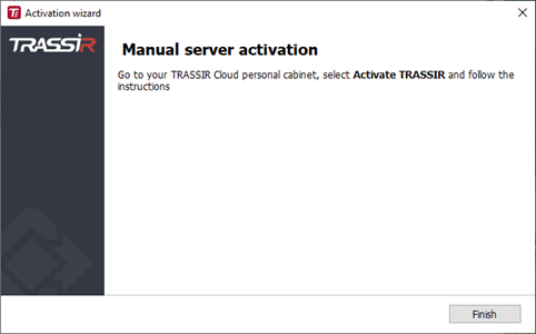 Activation Wizard will upload the selected license to the server and activate it. Click Finish to launch the TRASSIR software.