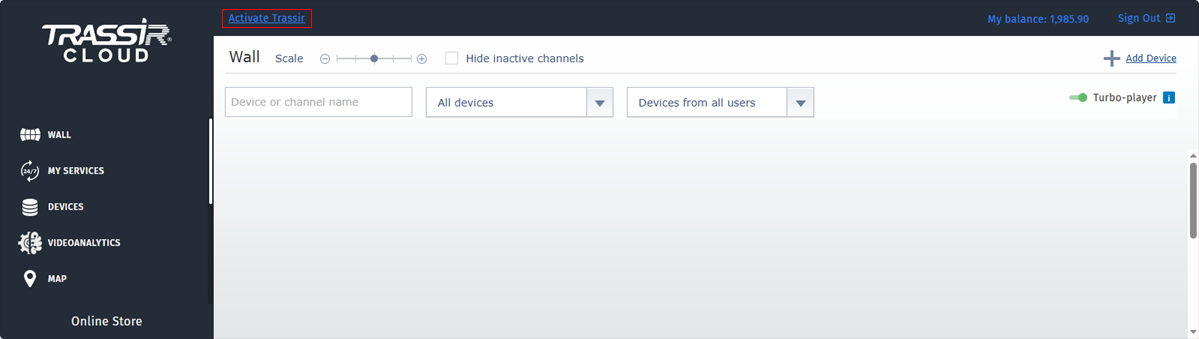 Log in to the Cloud site with your account. If you don't have an account yet, register. Click the Activate TRASSIR button at the top of the page.