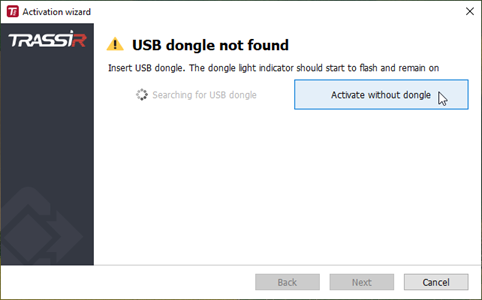 Launch the TRASSIR software once again. In the Activation Wizard window, click Activate without dongle.