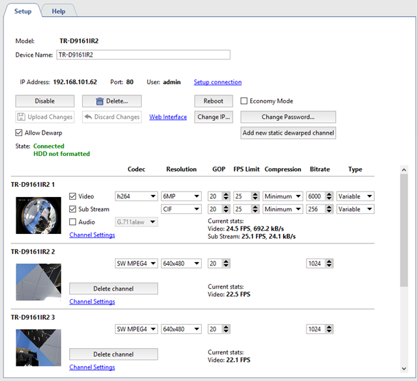 The video transmitted by Fisheye-camera has a number of features: wide viewing angle and intense image deformation on the periphery. The server allows you to dewarp the image into several independent channels and each of them will be recorded into the archive with its own settings.