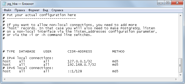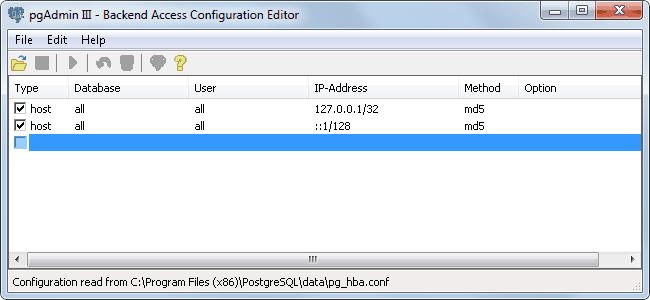 1. Open pg_hba.conf using a text editor (for example, Notepad).