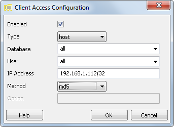 • Enabled - Set the checkbox. If the checkbox is cleared, the connection will be preserved in pg_hba.conf as a comment, i.e. it will be inactive.