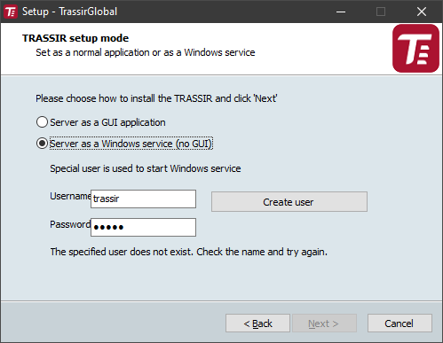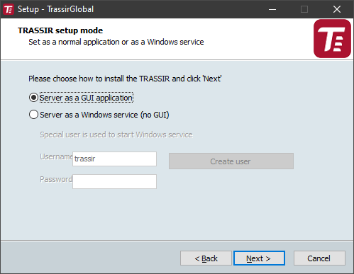 If you want to install the server as a Windows service, select Server as Windows service (without GUI) installation option and enter the user data which will be used to run the service. In case such user is not available yet, you can create it, pressing Create new user.... Press Next to proceed.