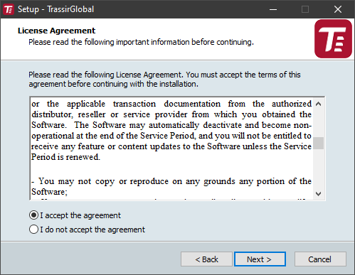 You can review the text of the license agreement on the License agreement screen. After reviewing the agreement, select I accept the agreement and click Next.