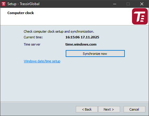 The installation wizard will prompt you to verify the correctness of the server's current date and time. You can synchronize time using an NTP server by clicking the corresponding button, or click the Windows date/time setup link to quickly navigate to the settings window. Click Next.