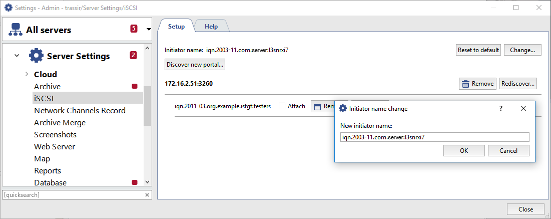 In order to configure server connection to the network storage via iSCSI, go to the iSCSI tab and click the Change button, if necessary, and enter an Initiator name. This name will be displayed in the network storage's log when the server connects to it.