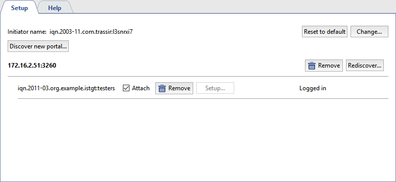 To connect the server to the network storage via iSCSI, set the Attach checkbox. The state will change to Connected and the logical disks configured on the network storage will appear on the Archive tab.