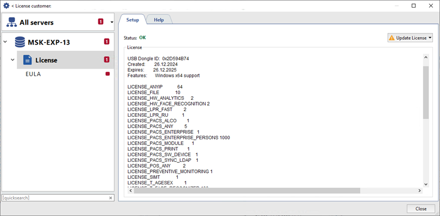 This section lets you view and manage server license. Click Update license to select a new server license file. It may be required, for example, when expanding the system.