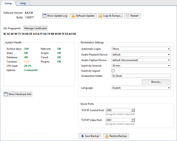 Save Backup - you can save your system configuration or system database backup copy any time and save it as a file or to the TRASSIR Cloud.
