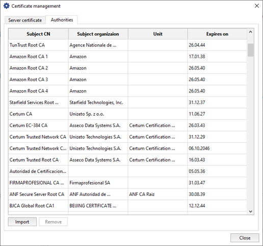 - Press Import on the Authorities tab to upload your certificate to create secure connection to other devices.