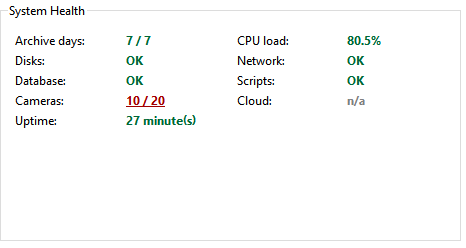 System health - Server performance measurements for rapid detection of critical server errors. The health metrics are duplicated, being shown in the Main control panel as well.