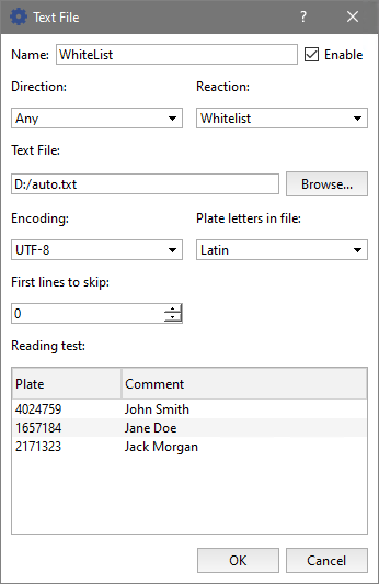 - Enable - This checkbox determines if this source of license plate numbers should be processed by the AutoTRASSIR/AutoPass plugin. If the checkbox is cleared, then license plate numbers from this list will be ignored and messages will not be issued to the operator.