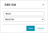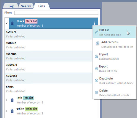 An operator can create and edit license plate number lists in the Lists tab in the AutoTRASSIR/AutoPass log area. You can create an unlimited number of lists. Press Add list to create a list and select the reaction type: info list, white list or black list.