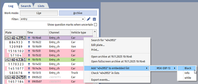 When a license plate number is recognized, it is highlighted in the event log by the light, corresponding to the list type to which it is added. If a number is added to several lists, all of them will be displayed near the recognized number in the operator's interface.