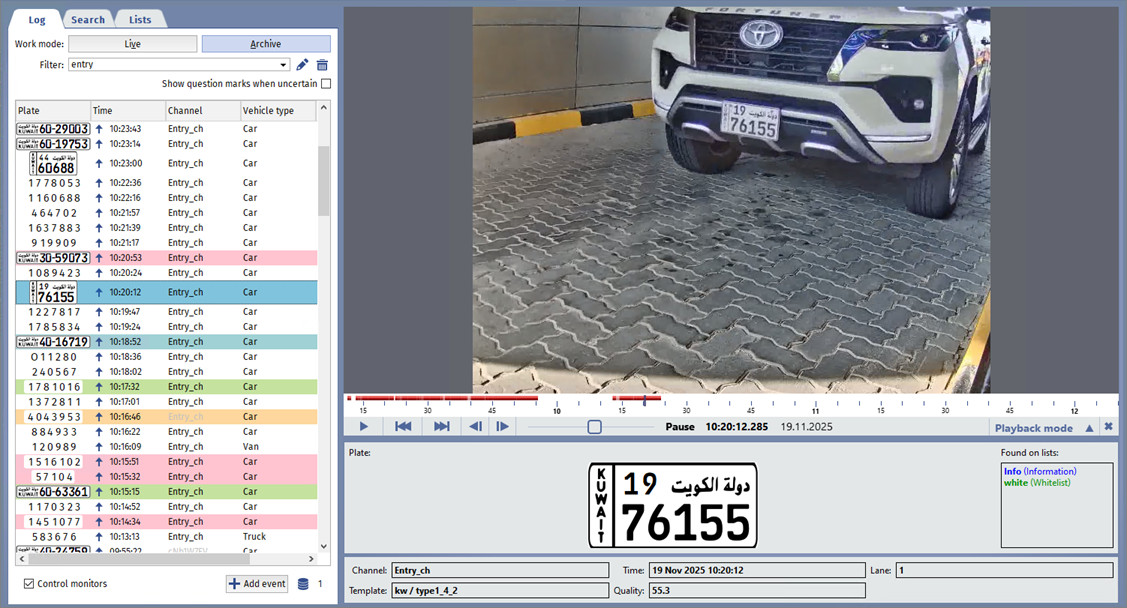 As a vehicle passes, the recognized license plate number will appear in the AutoTRASSIR/AutoPass log.