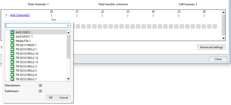 After adding a session add channels and set the streams, the archive of which will be transferred to the destination server. To do this, press Add Channel(s) and select one or several channels. If you need to transfer Mainstream or Substream only, uncheck the corresponding box.