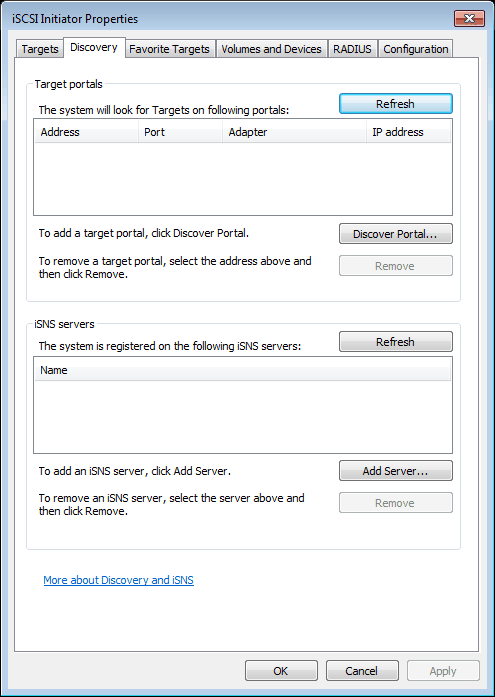 Go to the Discovery tab and click the Discover Portal... button to connect to the network storage