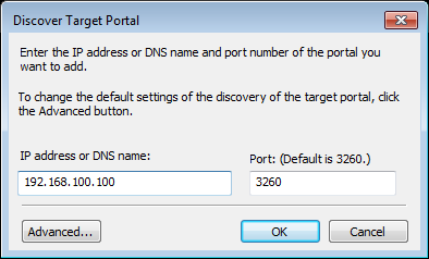 Enter the IP address of the network storage and specify the ISCSI service port that was entered during configuration of the network storage.