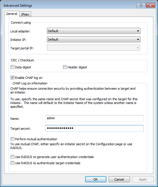 If you enabled CHAP authentication while configuring the network storage, click Advanced to enter the corresponding parameters.
