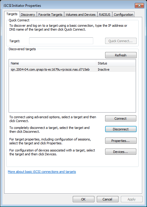 If there the network storage successfully connects, its identifier will appear in the Targets tab. And it's status will be "Inactive".