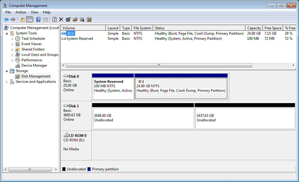 If all of these steps were successful, the new disk will appear in the OS. To locate it, open Computer -> Manage -> Disk Management