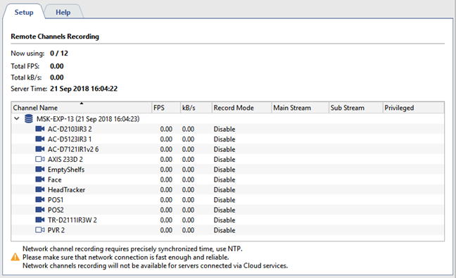 To properly record network channels, time must be synchronized on the servers. The local time of each network server is shown next to its name in the table. If it differs from your server's time, you must configure time synchronization across the network. The recommended synchronization period is two hours.